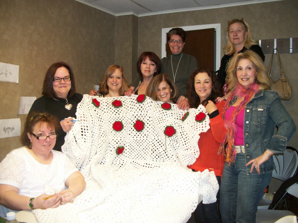 Foto de umas das peças confeccionada pelo grupo Mulheres Lusitanas-Philadelphia-. As várias peças feitas pelo grupo serão doadas a instituições dentro e fora da nossa comunidade e/ou rifadas em prol do Dia de Portugal. (esq.-direita) Maria Rebelo, Anabela Meireles, Manuela Moreira, Dilma Carvalho, Zeza Veríssimo, Ilda Santos, Berta Ribeiro, Paula Vilares, Manuela O’Leary.