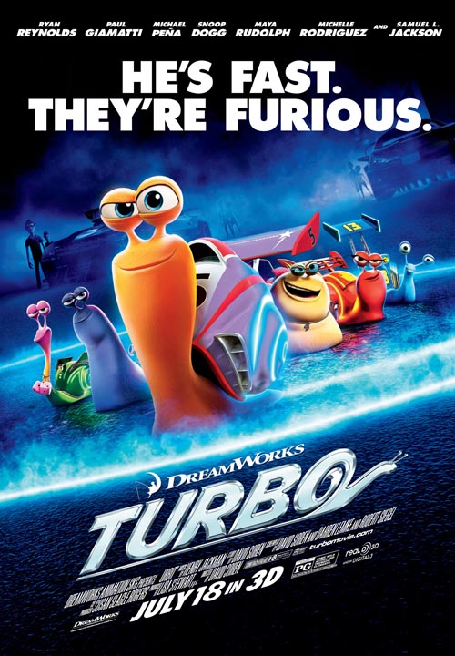 O filme animado Turbo estará nos cinemas a 18 de Julho em 3D. O filme apresenta um caracol de jardim comum, cujo sonho é de se tornar o caracol mais rápido do mundo, sonho este que se torna realidade.
