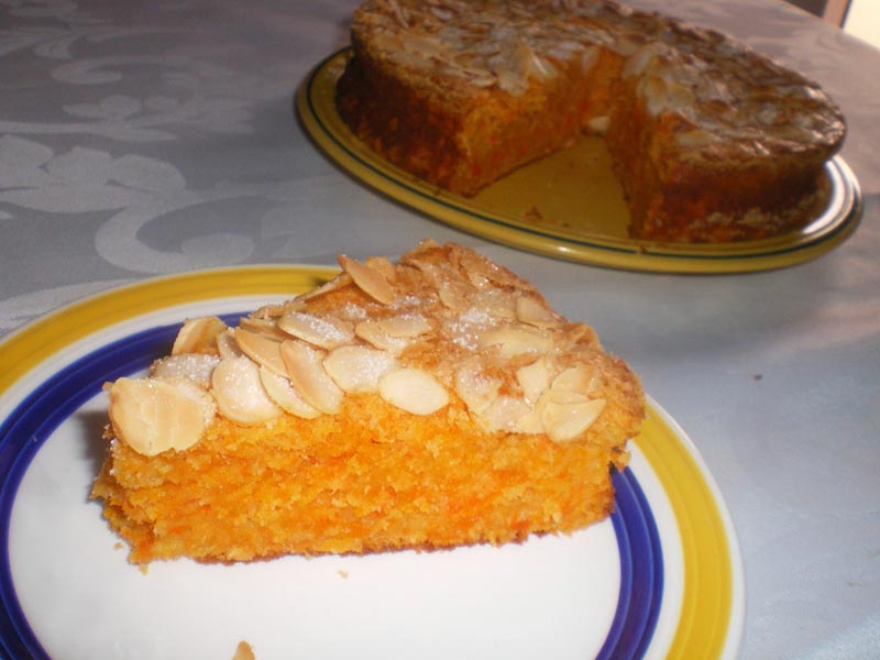 Separe as gemas das claras e bata bem as gemas com o açúcar até ficar um creme. Junte a raspa de limão, o óleo, a amêndoa ralada e as cenouras trituradas e bata tudo junto. Bata as claras em castelo e junte, sem bater, alternadamente as claras e a farinha. Coloque numa forma previamente untada com manteiga e polvilhada com farinha e por cima da massa coloque as amêndoas laminadas e polvilhe com um pouco de açúcar. Leve ao forno pré-aquecido até o palito sair seco.