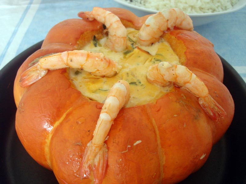 Corte uma tampa na superfície superior da moranga e reserve. Retire as sementes com o auxílio de uma colher. Faça uns cortes dentro da moranga e tempere com um pouco de sal.Cubra a moranga com papel-alumínio e coloque em uma assadeira com a cavidade voltada para baixo. Leve ao forno pré-aquecido a 180 graus até que a moranga esteja macia. Reserve. Em uma panela aqueça o azeite e refogue a cebola picada e o alho picado Acrescente o molho de tomate os camarões (já temperados com sal e pimenta), a farinha de trigo dissolvida no leite, o sal e a pimenta. Tampe e deixe ferver por 5 minutos. Retire do fogo e misture o requeijão já misturado com o creme de leite sem soro Faça a correção do sal e da pimenta, se necessário. Recheie a moranga com este creme e Leve ao forno pré-aquecido a 180 graus por aproximadamente 25 minutos. Polvilhe com o cheiro verde e decore a superfície com camarões grandes cozidos em água e sal.