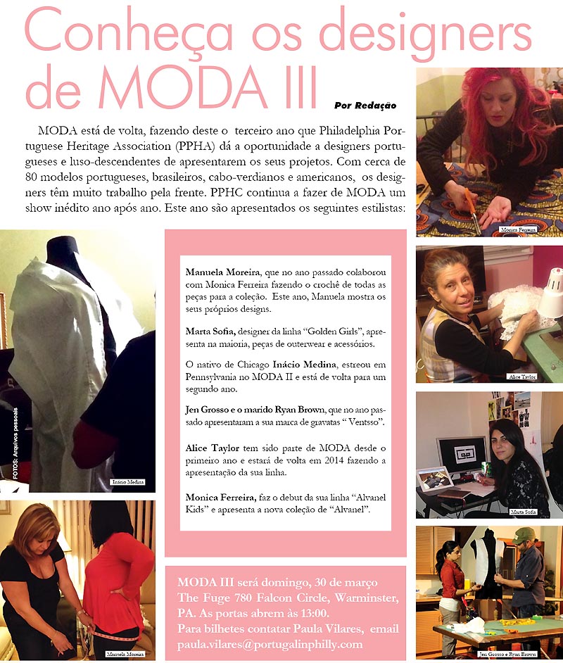 MODA está de volta, fazendo deste o terceiro ano que Philadelphia Portuguese Heritage Association (PPHA) dá a oportunidade a designers portugueses e luso-descendentes de apresentarem os seus projetos. Com cerca de 80 modelos portugueses, brasileiros, cabo-verdianos e americanos, os designers têm muito trabalho pela frente. PPHC continua a fazer de MODA um show inédito ano após ano. Este ano são apresentados os seguintes estilistas: