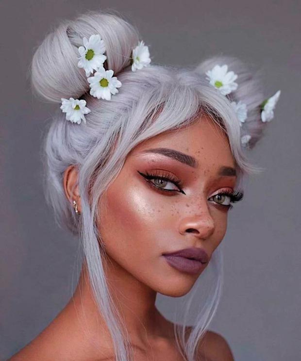 Os coques duplos que parecem ter saído das revistas em quadrinhos de desenhos japoneses é uma boa pedida para quem quer prender os fios de forma bem descontraída. Para fazer é simples: Separe um pente fino e, com o cabo, divida o cabelo ao meio, riscado o centro da cabeça. Depois faça dois rabos de cavalo bem altos com as duas metades de cabelos separados. Use elásticos de silicone transparentes ou da cor de seu cabelo para amarrar os rabos de cavalo bem firmes. Para terminar, enrole todo o cabelo dos dois rabos de maneira firme, do elástico até as pontas. Use grampos para fixar o coque a raiz do cabelo. Space Buns finalizados!